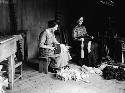 Previous Image Next Image Shetland Spinning and cairding. Andrina Petrie and her mother Barbara Petrie (nee Tait) carding and spinning. Stretchers along wall, large sock brods, Shetland scarf.