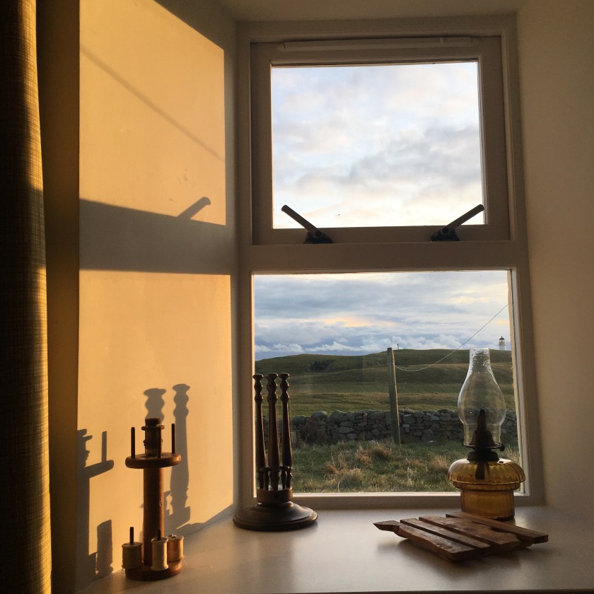 The light in the croft house dims sooner than at Mati’s house. The croft’s windows dictate the change in the amount of light within. Two – feet deep walls hold the place up. The deep walls narrow into the windows – each of which look out to every corner of the globe on this island which is only three miles long. I look out south-facing to the light house and gauge the weather by the grass waving or whipping in the wind and by the waves crashing or ebbing on the sea.