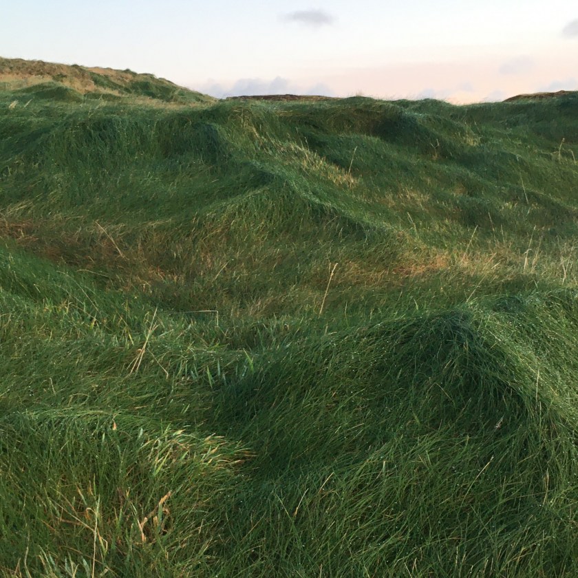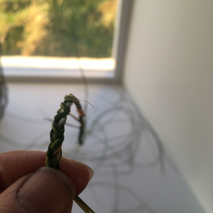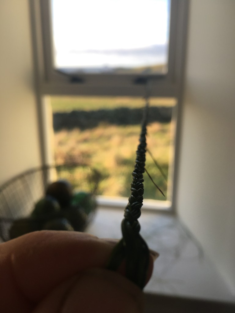 On the second day, Marie and I cut tussock grass, which is growing just below the chapel, with house scissors. We bag it. I want to knit it and make a lace curtain from its yarn. I’ve long since loved Shetland grass which grows at great length untouched, untrodden on and forms in dune-like shapes carved by the wind. We cut it without knowing its possibilities or strength. I spend 3 days and evenings plaiting the grass into a long length and a ball of grass yarn. The grass is strewn across 3 floors and stuck to everything. When knitting and unknitting, because I am dissatisfied with the results, the grass yarn bears the memory of the stitch.