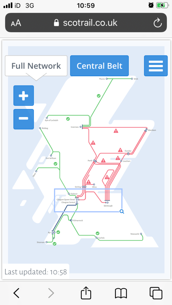 Between Newcastle and Aberdeen, a friend messaged me and I relayed all the problems of travel and that I was heading for Edinburgh and there had been flooding and I was hoping it would be cleared up by the time I got there but if it wasn’t – I had no idea. She suggested Megabus out of Edinburgh and sent me the times of the two buses to get me to the ferry in time (just) for the overnight crossing to Lerwick and my 9am meeting of the house I am buying the next day. She mentioned a regular bus service could also be an option if there were no buses provided for stranded passengers. But I knew that booking had to be way in advance because of corona and social distancing, everything was stacking up against not making the ferry. In my head, catching a bus was not an option I had thought about or considered or could do. It seemed unthinkable to go the last 130 miles by an unplanned bus. She screen shot two photos of mega bus times.