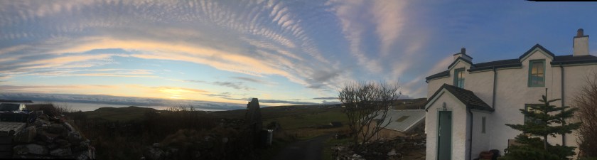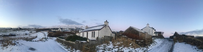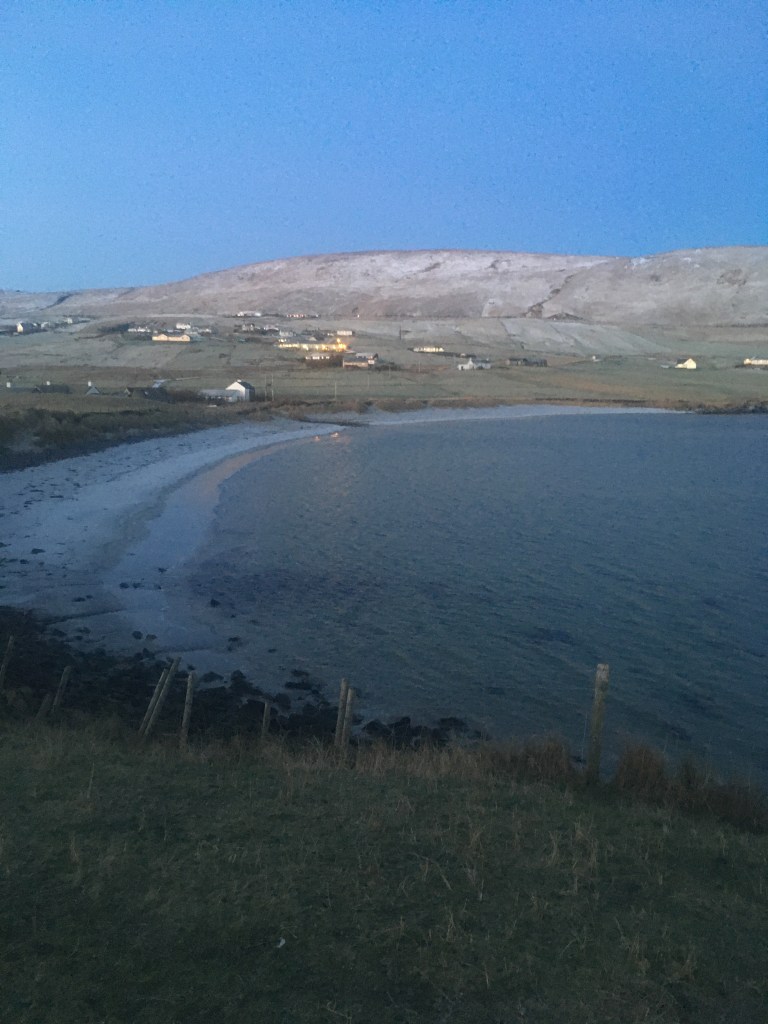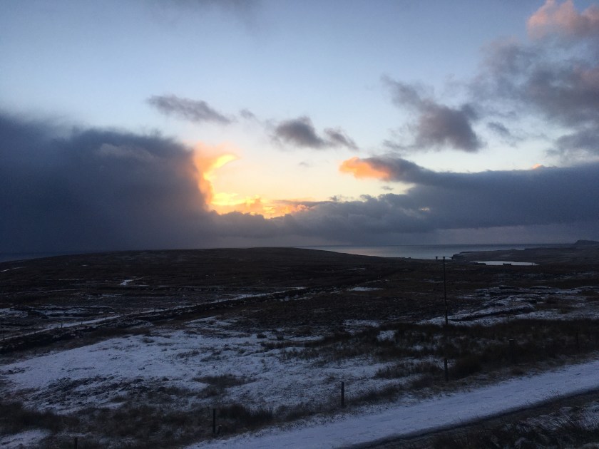 On the doorstep, the air of the first pre-dawn breaking light is heavy with the scent of peat smoke. It has faintly snowed as if salt has been laid down. Eleven geese fly in a staggered distorted V line, calling as they fly overhead in the dark blue sky. The fine white snow covers the earth. I’m heading towards the beach, it is 7:30am and the sky is a deep mid blue, the sun has not risen but the horizon is a faint burning pink line. It is neither dark nor light. Everywhere is silent apart from the trickle of the brook beside me babbling, occasional geese flying above and the ducks at the top house waking. Few houses have a light on. It is Winter hibernation time – even Alfie went back to bed after he’d eaten at 6.