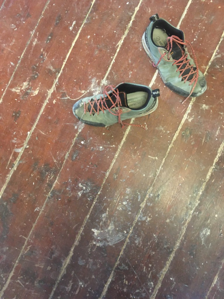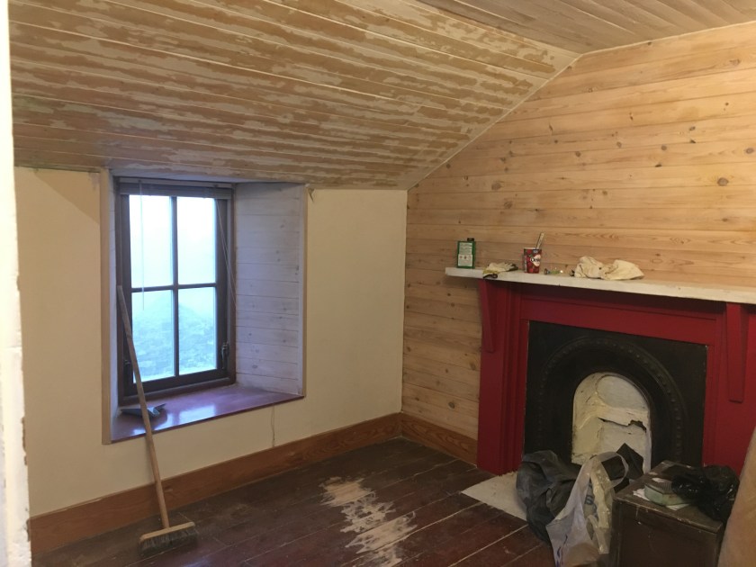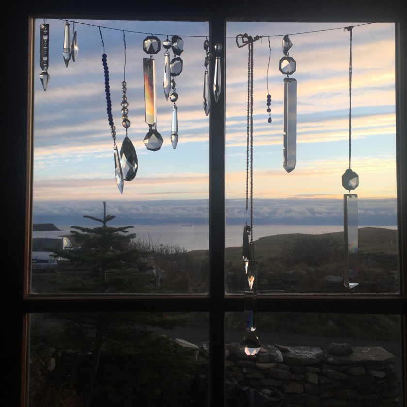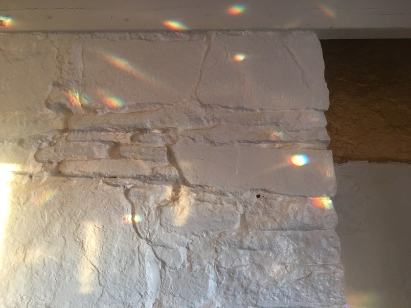 On my return, the sunrise has crept into the porch, indicating a return of the sun to a more easterly position. When I open the door, I see the sunlight flooding across the bare chimney wall in a shard of light. The crystals throwing rainbows onto the ceiling, the shadow of the bar in the window frame flanks the wall in a perfect shape.