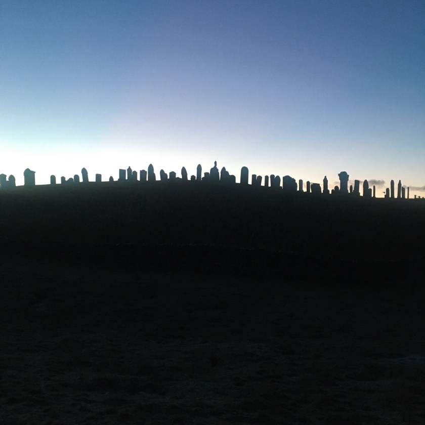 I think, as I walk, that it is as if I have never lived in any other place, yet I have only been here about 20 weeks. The sand is frozen in the shapes of yesterday’s footprints. I came for seaweed but it lies frozen in the sand so I leave it. The beach lies below the Winter sunrise horizon line – it is entirely in shade and entirely frozen. To my right, the cemetery is outlined in the early morning light. I can see where Susan lies next to her parents above a thousand years of history. The grave stones stand as a crowd of people against the light.