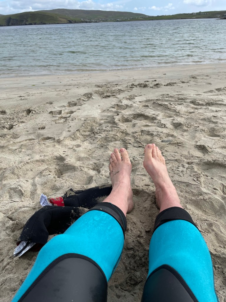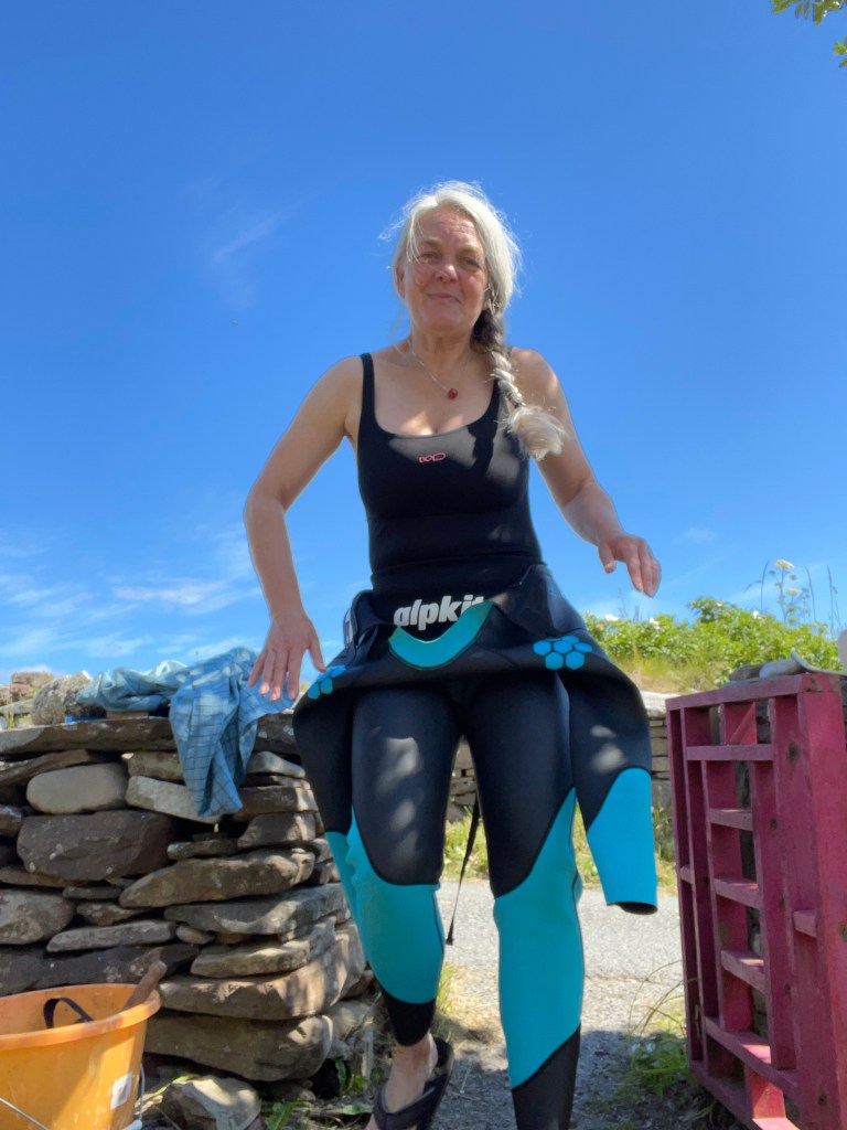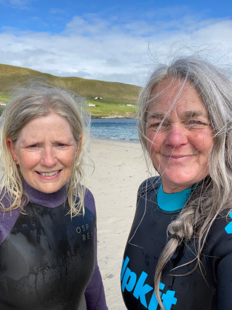 One day, I went to Scousburgh, with another friend. I started swimming in the wet suit, got acclimatised then peeled it off and went back in, in just my costume. We brought the suits and shoes and gloves back in a large blue tub. It was a fine afternoon spent on one of the finest beaches in Shetland. A local group of 4 women were leaving as we were arriving. Women love the water.
