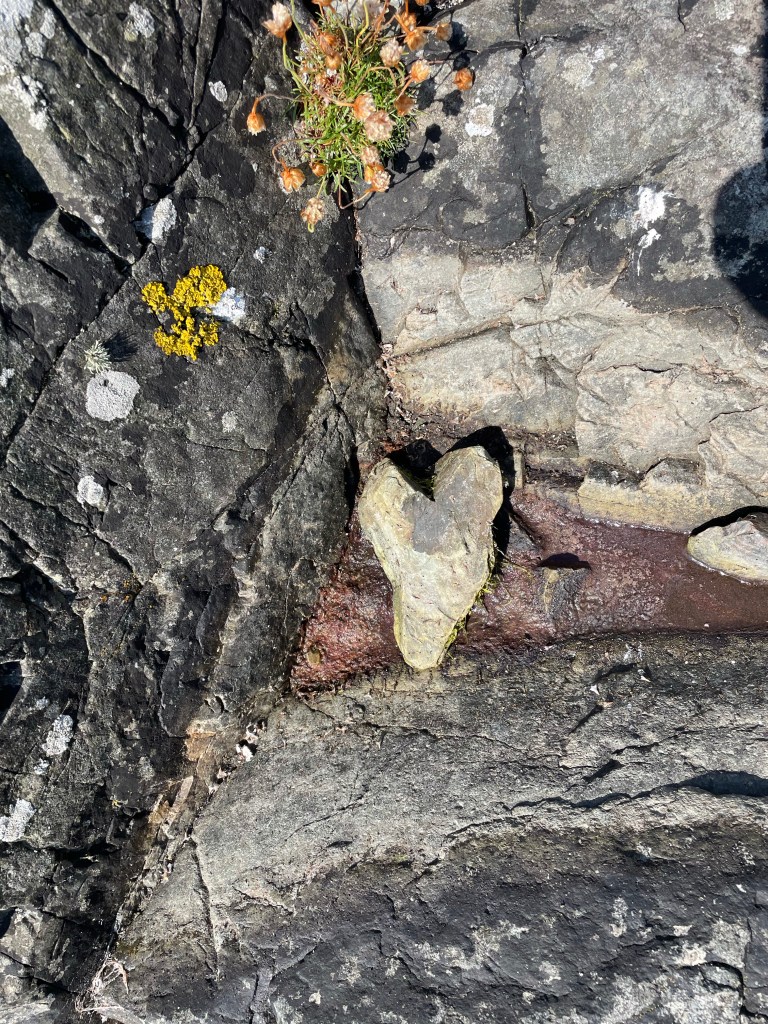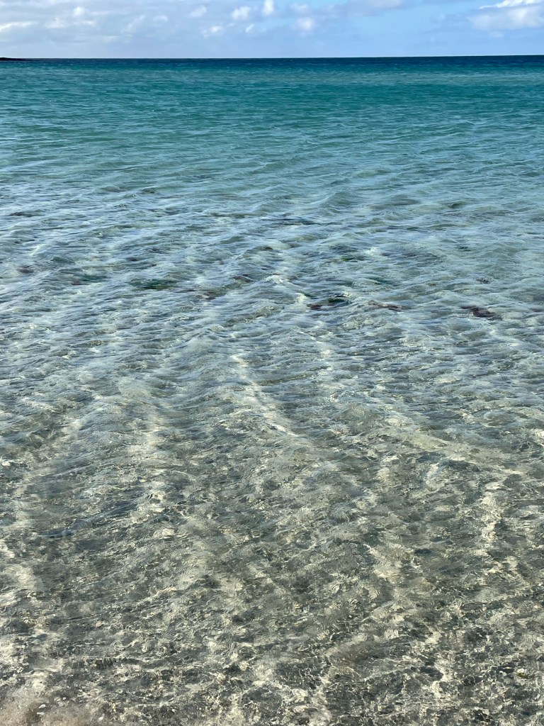 Last Saturday, the sea was pale green, reflected from an overcast sky. Each time, the sea is different in colour, clarity, choppiness, or calmness and each time we are accompanied by different creatures, a cheeky seal or birds or a crab and sometimes jelly fish but always, and every time, it is a wonder and the sound of water is a healing property. Sometimes, the sun glistens across the surface of the water and you are part of a different world – not of land but of sea.