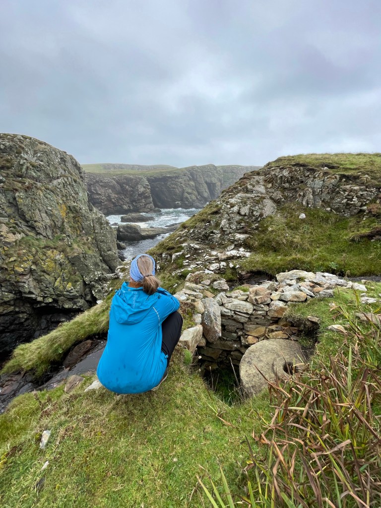 On Sunday, we walked along the coast line in Levenick to the Broch (or what is left of it ) with a special view from the old water mill grinding stones. It was boggy and wet underfoot, the fog was lowering and the landscape became atmospheric.  So much tangible history here touched by many hands over time. This was Deb’s favourite walk.