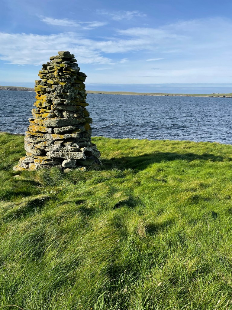Yesterday returned to Jarlshof to walk to Sumburgh lighthouse along a track that skirts the coast which we saw clearly marked from a standing point above, last Friday.   Along the track are many Cairns, we placed stones and I made a wish.   It was sunny and breezy and light – a perfect walk, and this became my favourite walk.