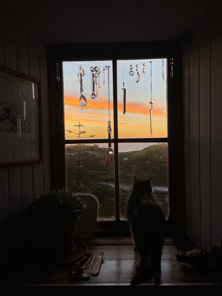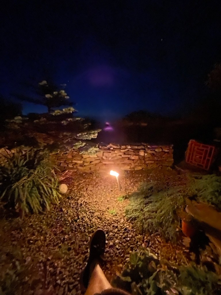 The sky is studded with stars. The only constellation that I know is the Plough. It is ahead of the house in the North East, I think. The rest I do not know but I look around and around in awe of miles and miles of stars, not seen as clearly in cities or towns. Slowly, faintly, the sky begins to lighten in the East, showing its arrival through the crack between earth and sky, splitting and dividing the darkness into sea and sky. Still, the taper dances on unhindered, glowing light and a slight warmth. I am not cold here on my thinking bench between house and porch, drinking tea and eating a Tunnock biscuit. There is no sound other than the sea down at the beach.