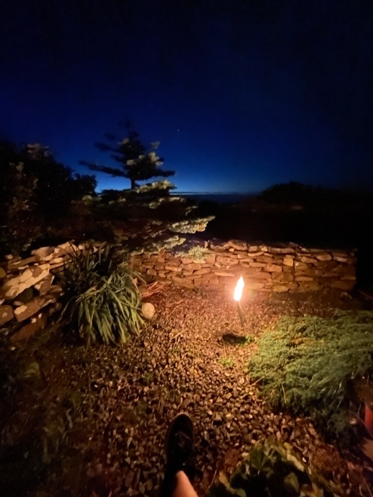 This fulcrum of time of darkness and light tipping from one to the other, is magical. What a gift to be alive at this moment, in this place. There is no nip in the air but it is clear and crisp. The taper flickers on. This is turning out to be one of my most beautiful mornings here, to watch the world in front of me change from dark to light guided by the light of a flickering outdoor taper, serenaded by the sound of the waves.