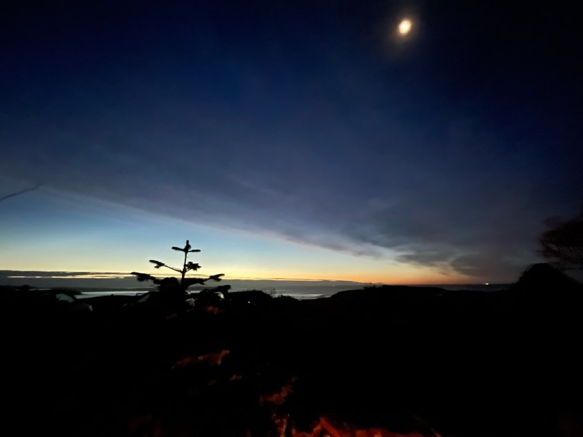 The stars have all but disappeared. The light is magical. I use the camera to capture the moon. There is only enough battery to take three photos before it shuts down. I capture the moon in two.
