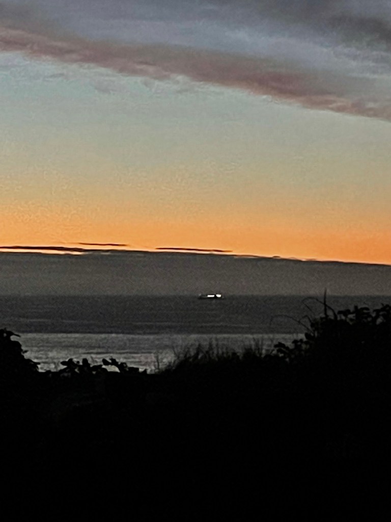 At 5:45, the sky has a faint peachy glow in between the sea and sky horizon line. As I look South, I see the tiny glowing lights of the Northlink arriving far away. What a peaceful calm sailing the passengers must be enjoying, sailing into sunrise.