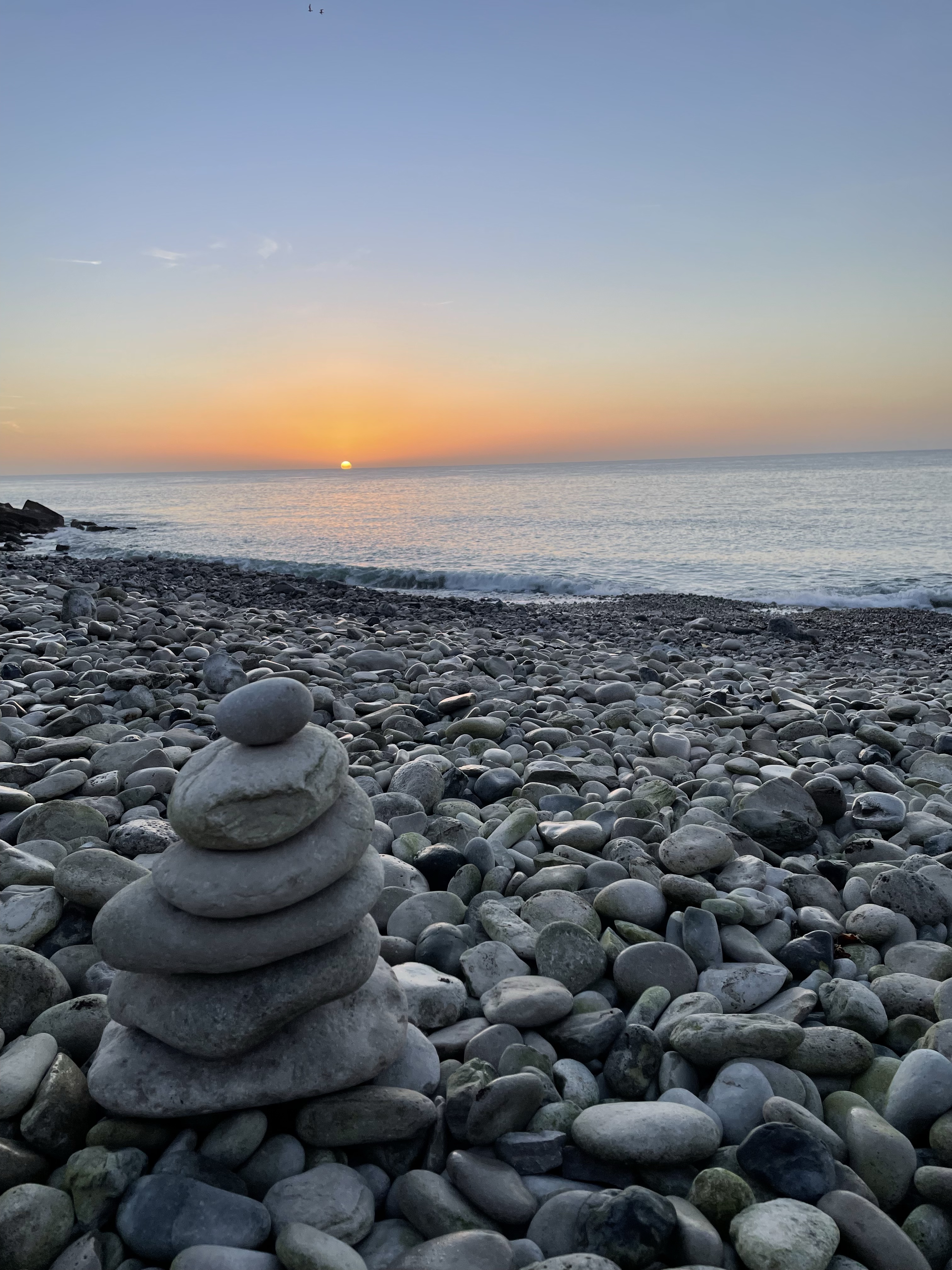What I soon realise is that I cannot rush building a pebble tower. There always needs to be a solid safe foundation stone. I cannot grab just any stone because any stones laid on top, rely on the base and each other to stand strongly. I soon realise that I cannot rush the build otherwise it will be messy and unstable, ultimately falling down. The building of a pebble stack at sunrise, which I briefly recognise as an analogy of me and my rebuilding of a life, teaches me to find a solid foundation stone. As I build, I recognise myself as both the possible unstable stack and the foundation stone. I connect to the stack because I am not entirely stable at the moment and I have been building on instability, therfore, becoming wobbly and unstable.