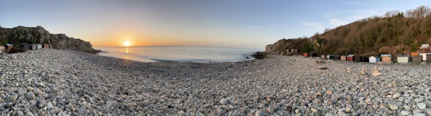 At Church Ope Cove, I arrive just in time for sunrise. I squat on the pebble beach to build a pebble stack, reaching arm’s length for stones.