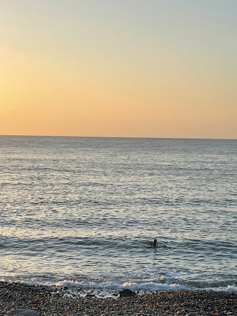 Pebbles are pulled back into the sea. The ebbing tide rolls a cacophony of singing stones. Once again, I reach for my knitting and knit to the rising sun, feeling the sun’s warmth and glow upon my face, the pebbles singing to the ebb, a man swimming and a rare deep, honest contentment fills me from inside out. Nature has taught me a clear lesson.
