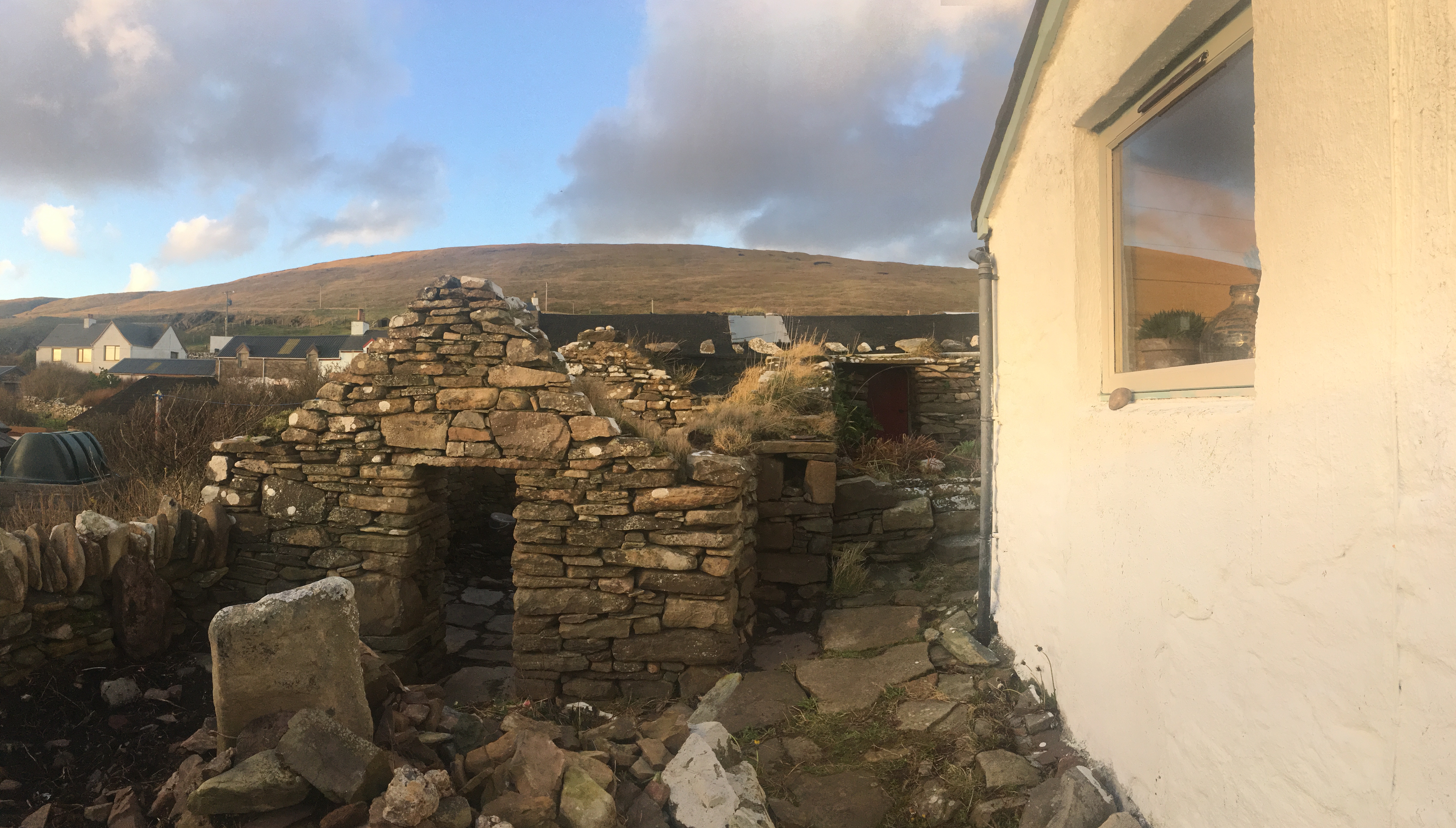 In my dream, I walk/ walked along the side of my beautiful croft house to the roofless byre, to sieve the soil to grow things but nothing really grows/ grew outside in Shetland without a great deal of protection from the elemental sea salt burning winds and harsh rains. The time-heavy extra labour to protect growing outdoor plants that grow horizontally below the storms, takes its toll on body and soul and does not always pay off in fruitful crops or a feeling of personal value or reward but becomes at best, a learning curve and at worst, exhausting. I began to dream of having a polycrub but that was out of my reach financially and with land space. I then began to realise the value of land on that island. Land struggled for by many for many generations and still held as priority.