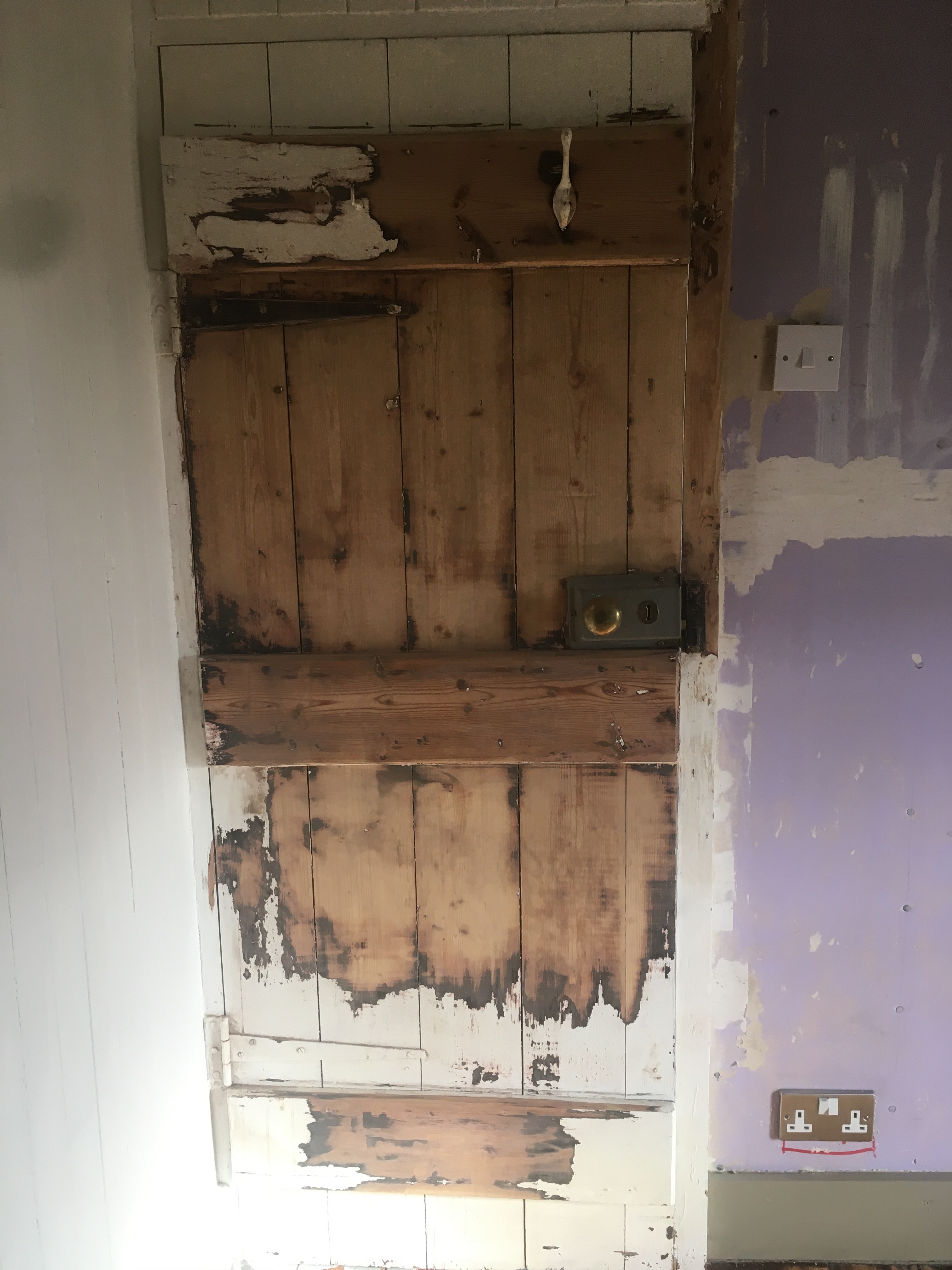 I open the front porch door, then, I try the house door with its mismatched glass panels. It opens in to the tiny vestibule area. To the right, there is a third old, board-door, painted white with a hand-hewn square wooden knob, which I turn to the right. The simple mechanism lifts a wooden latch inside. That sharp click sound of the latch lifting and hitting its wooden casing is the sound that I will forever remember of this place. It is my first sound here and it will probably be my last when I leave. It is a click of old wood against old wood, heard by every man, woman and child that has ever entered this house before me, for the last 180 years. Human touch leaves tangible traces of every hand that has opened it before me. The patina of years lies dirty on the paintβs surface.