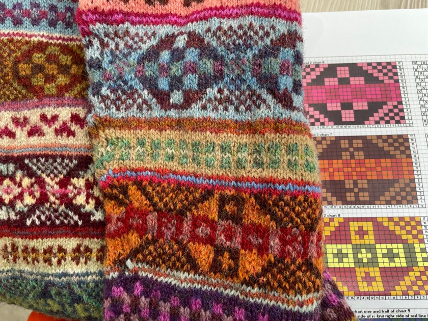 My jumper is knitted in Jamieson’s of Shetland spindrift using over 90 colours – some small lengths, some longer – these colours I have had left over from previous projects. As the colours are not often repeated, not great lengths are required. But you can do this differently. Use your stash or buy just 4 colours or even 2. The choices and permutations are endless but this relies on you. It relies on being excited to try this, to work out your centre front (which in my case, mirrored my centre back) and making sure that your motif bands align. It is about enjoying colour, swatching to experiment for colour combinations. It is a fun package and I would love you to have a go.
