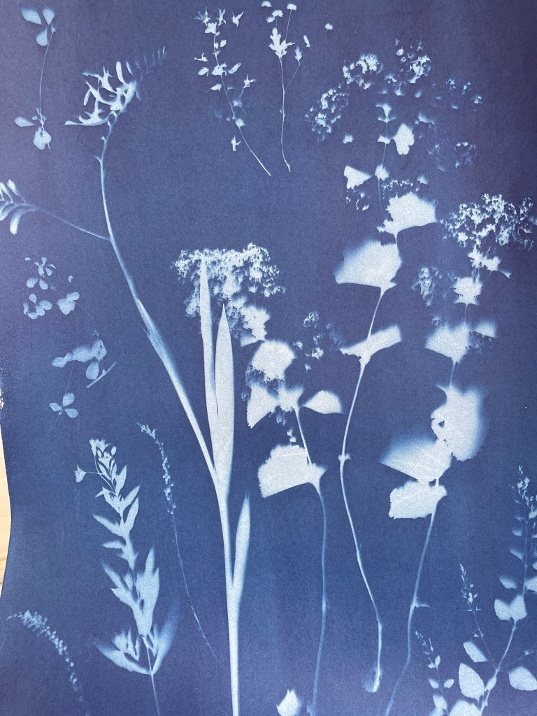 My flower cyanotypes are subject to risk and mishaps and then there is the sun.  The sun is vital in the developing process of the sheet and when breeze joins in, my carefully pressed flowers blow across the yard of Bloc Studios and I don’t know whether to collect the hard earned flowers or pick up the half baked cyanotype.