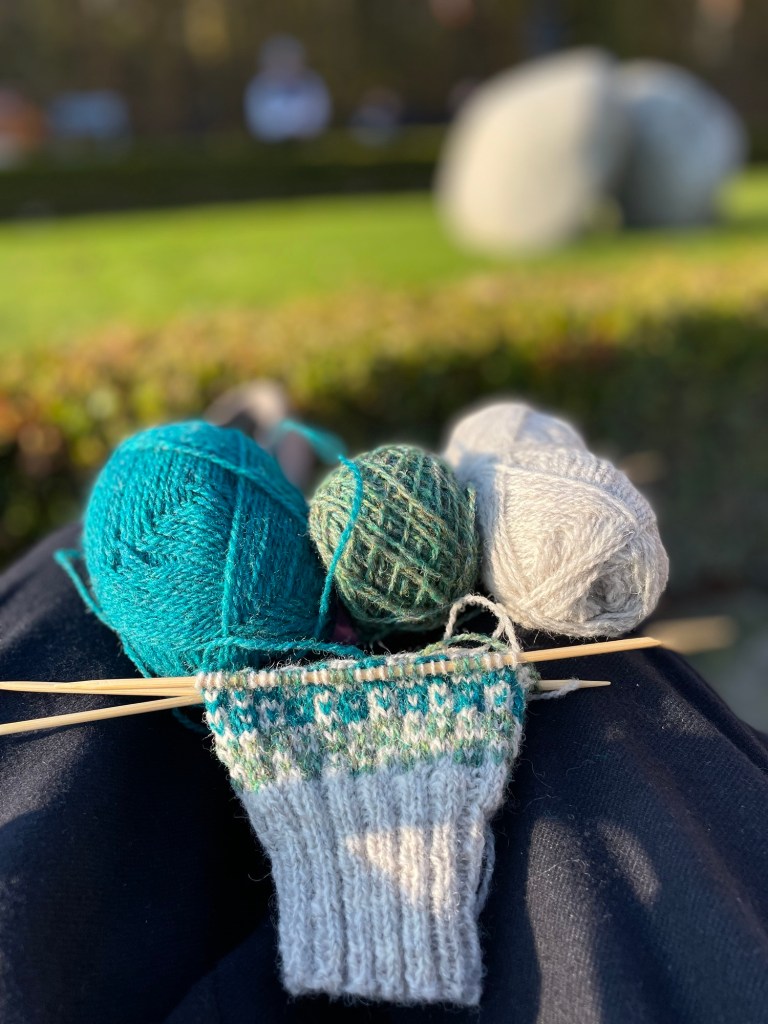 But, here it is, I’ve made a new Little Kisses Mitts pattern – the left mitt was knitted using greens inspired by the the garden against the pebble colour of Lee Ufan’s stones in the summer garden exhibition in the Rijksmuseum, in Amsterdam. Then knitted a matching mitt to the green one but using berry colours – Cherry and Raspberry. This pattern is a very easy knit using a cute peerie Shetland motif, which looks like little hearts in boxes – which is how I finally came to choose its name – Little Kisses Mitts.