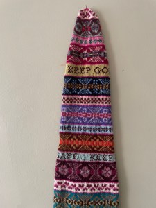 For the textile art exhibition, I titled the long Fair Isle hat scarf, ‘Trying to Just keep going’, but, it is also a wearable knitted artwork, using intricate, colourful, Fair Isle motifs to create a long hat /scarf. You can easily follow the pattern and make your own artwork
