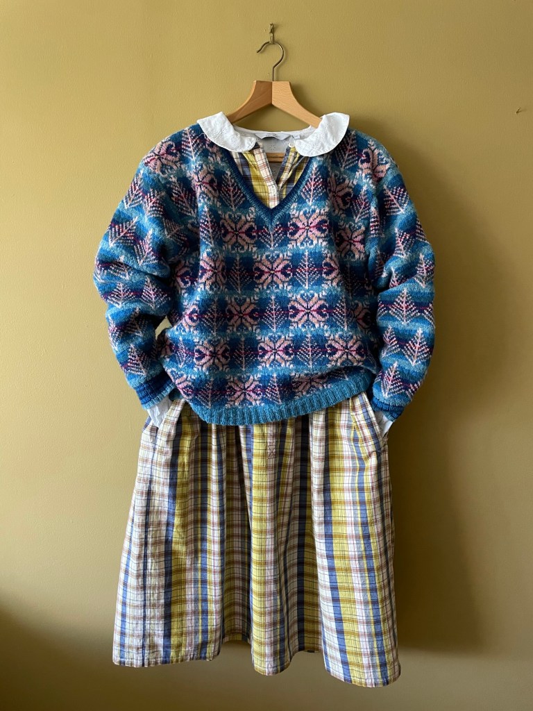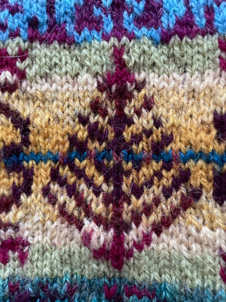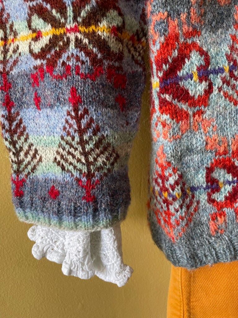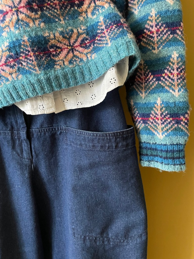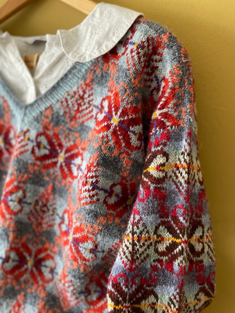 I have been used to putting myself inside my knitting patterns to show how they look, but last week, I found a new way to show off the Kaleidoscope Jumper and the way in which my test knitter, Mary, knitted the Tree and star sleeve which is an add on pattern. Here are a few of the photos that I took of both jumpers and some of my clothes – I have a favourite.