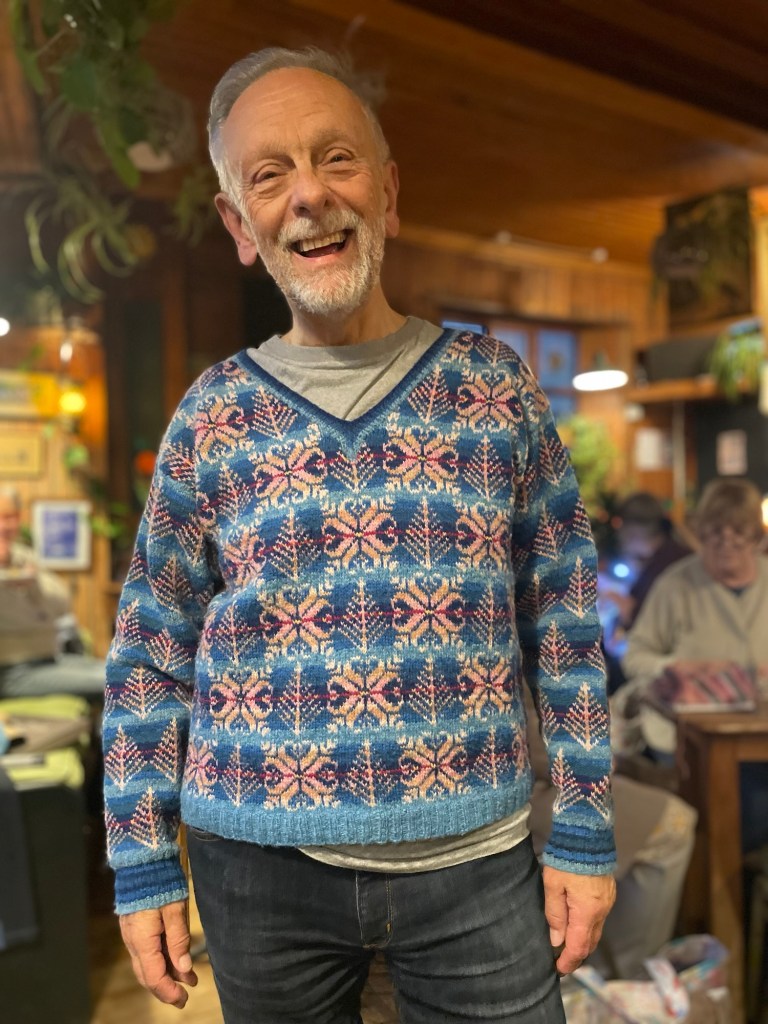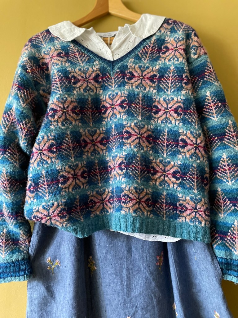 This hat pattern is a perfect easy starter project if you would like to knit the kaleidoscope jumper project because they both have the same easy Shetland Tree and Star Motif
