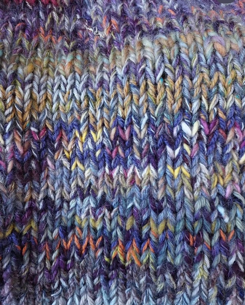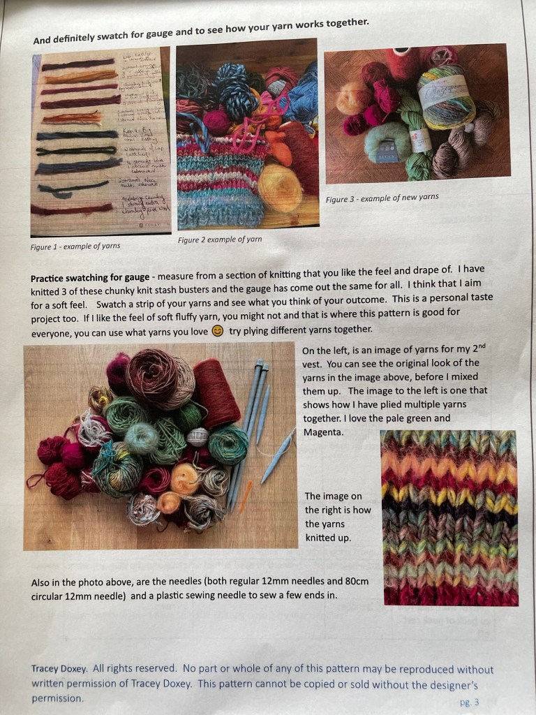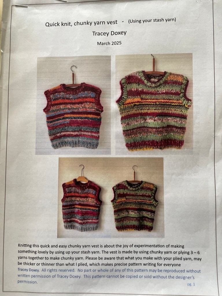 It is a very quick and easy knit vest to knit using stash yarn and large 12mmUK needles. It flies off the needles with great speed – mine took me three days to knit from beginning to end. It is something to love, something lovely to knit and very useful by using up your stash yarn – that you also bought because you loved it.