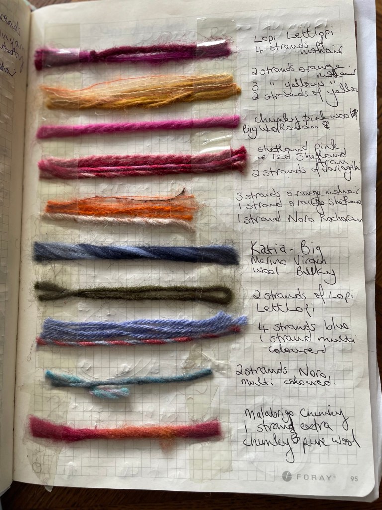 For a yarn example, you can see here I used 4 strands of mohair together with 1 strand of Lettlope or two strands of orange mohair with five strands of very thin of the yarn or, for example, one of the yarns that I used on its own was the Big Wool by Rowan so the experimentation of yarns plied together goes on and on and the results are a surprise and exciting which makes you excited about colour knitting.