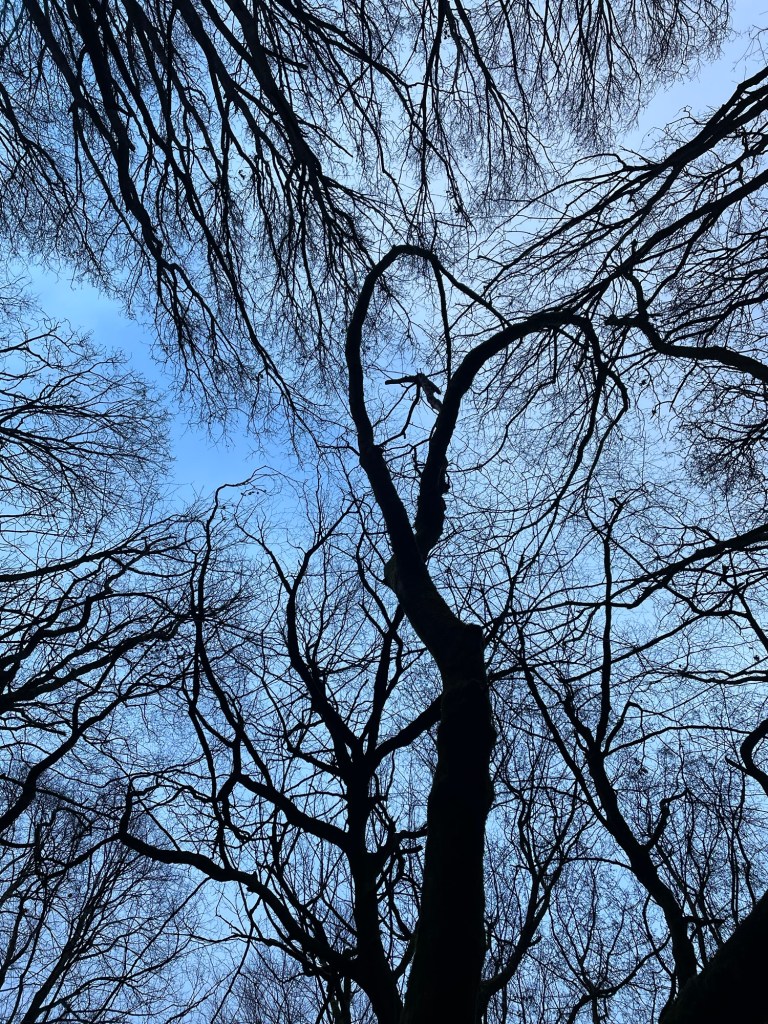 Last week, we had one small window of a couple of hours of light and I walked through the woods looking at the sky between the bare branches up high.