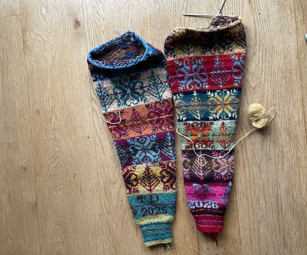 Here are the two sleeves that I have just finished – one in 2025 and the other yesterday, 2026. The Tree and Star sleeve pattern has a full alphabet sheet so that you can add your own initials and date your project