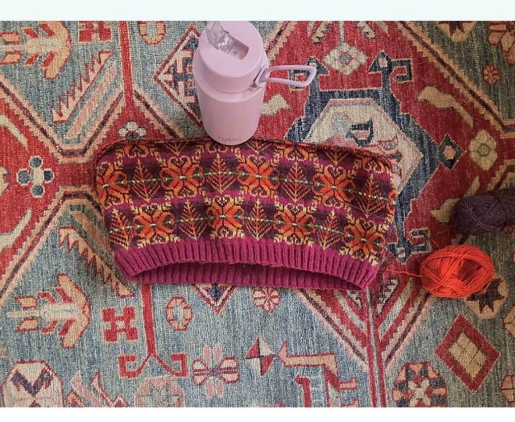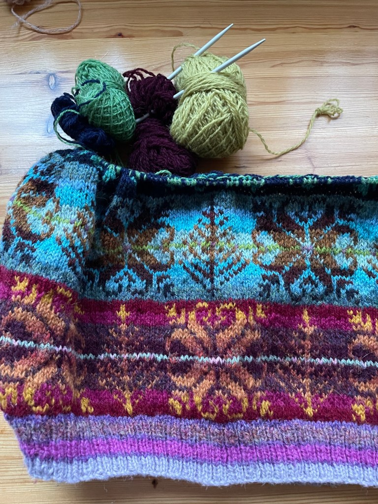 I want to acknowledge and thank my creative spirit for developing this simple Shetland Yoke motif and simple hat into workshops, colour blending, and finally – a new jumper pattern. I have learned so much along the way, in 6 years.