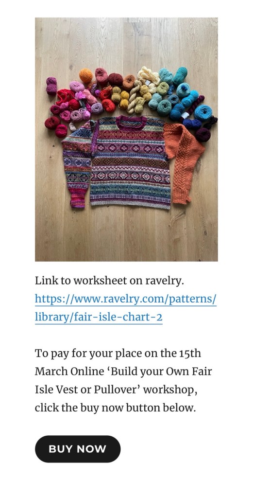 Here are some examples of my Fair Isle charts/ patterns – The Long Fair Isle Hat/Scarf and the Fair Isle chart. If you would like to learn how to build your own Fair Isle vest or jumper from my Fair Isle chart, then I am running a workshop on how to do this on 15th March.