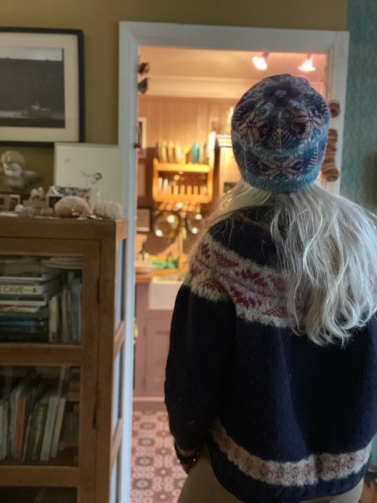 Over the years, I’ve made this hat using varying yarns and colours. I’ve blocked it in to a shape that resembled a slouching hat or a kind of beret. I still have two of these hats from 2015, and I’ve worn them in all weathers and in many countries. I’ve left one and lost it in places but I have always retraced my steps and gratefully been reunited with the hat that now is part of me every winter. Seeing the early photos of this hat, I see a different shape entirely to the one that has morphed and shaped to my head through being soaked in gale force rains, being stuffed in pockets and in bags and left for months in a drawer. In November 2019, I was living in Brindister, West Burrafirth, Shetland and wore this hat every day whilst walking around the voe. By now, its shape had morphed into a basin shape and I felt lost without it if I ever forgot it any winter day – especially in the piercing winds.