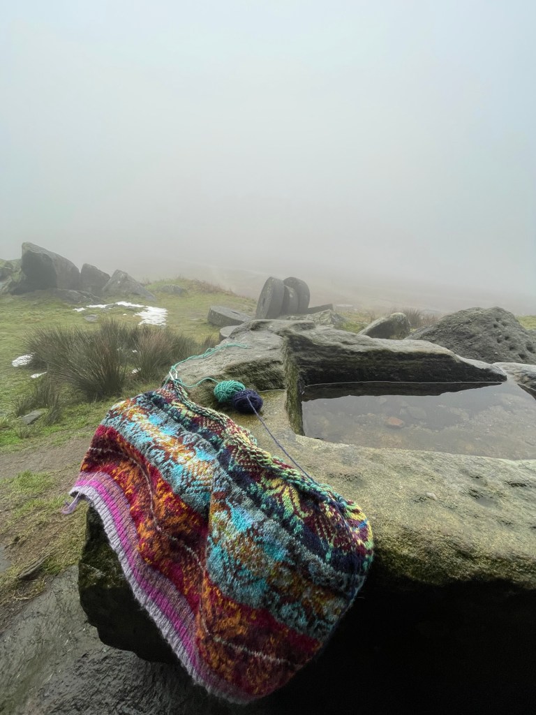 Afterwards, my knitting was wet with cloud and mist. It smelled of Lanolin and the Peak District. How lucky are we in this country to live near such peaceful places when the world is in deeply sadening pain – and we feel it.